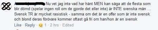 Kvinnan fick medhåll av flera andra kommentatorer som stämde in i kritiken mot det svenska rättssystemet som ”rasistiskt”. En överrepresentation av utländska namn bland dömda förklarades med att rättssystemet medvetet friar svenska gärningsmän om offret inte är ”svensk och blond”: