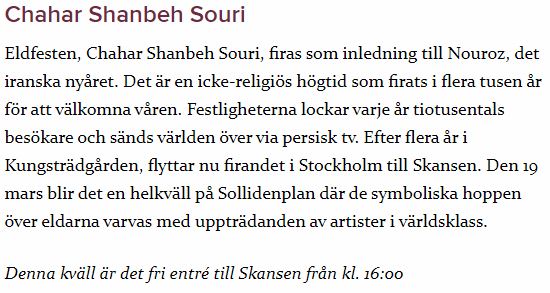 På 1990-talet firades ’eldfesten’ i samband med det persiska nyåret i Stockholms förorter. I år flyttar det in på Skansen och Kungsträdgården, dessutom med gratis entré – något som inte brukar förekomma vid det svenska nyårsfirandet.