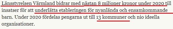 Det är Länsstyrelsen i Värmland som nu skänker åtta miljoner av skattebetalarnas pengar till 13 kommuner för att underlätta etableringen för nyanlända och ’ensamkommande’. Bidraget från Länsstyrelsen går under projektnamnet ”Vardagsliv i Sverige”. Det är en fortsättning på det skattefinansierade projektet ”Föräldraskap i Sverige” som hade sin start förra året i flera av länets kommuner.