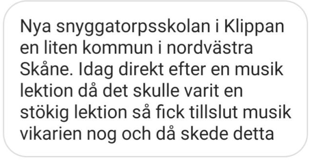 Den 3 september mottog vi ett tips från en elev med en video som uppgavs visa hur ett invandrargäng försökte tränga sig in i ett klassrum där en lärarvikarie höll musiklektion. Eleverna hade ingen rätt att vistas i lektionssalen men vägrade att lyssna på läraren. Istället försökte de storma honom samtidigt som bråkstakarna syns filma sitt eget angrepp mot läraren.