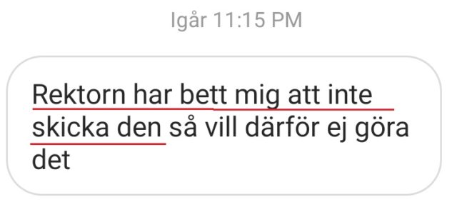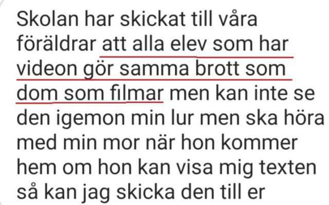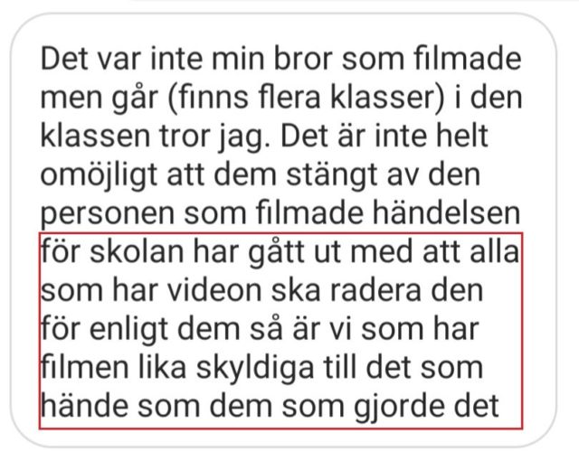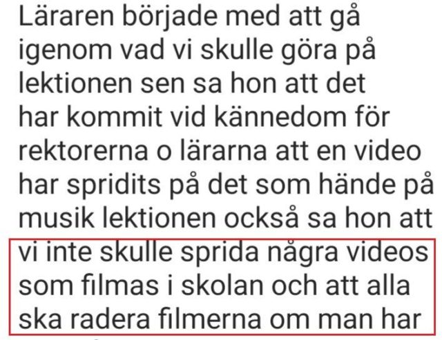 – Nu… vet jag inte riktigt vad du pratar om. Jag kan inte gå in i individuella ärenden. Men vi pratar med våra elever om att vi har filmförbud. I detta fall vet jag inte vad du pratar om.
