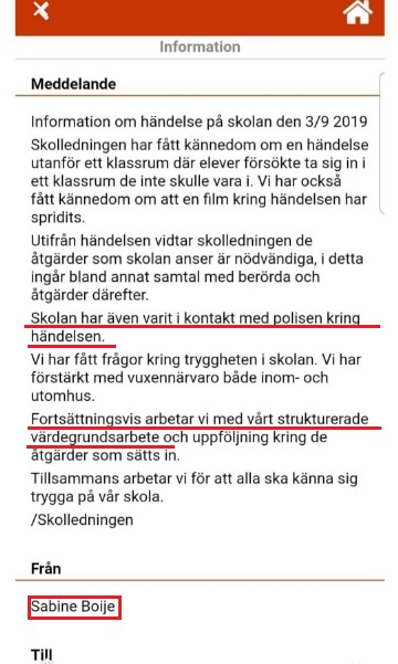 Skolledningen: ”Fortsätter med värdegrundsarbete” Efter att händelsen uppmärksammades i media har skolledningen informerat elevernas föräldrar via en webbaserad skolportal.