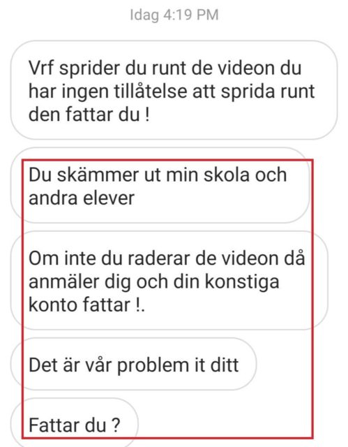 Elever hotar Samhällsnytt Efter publiceringen har vår redaktion även mottagit flera hotfulla meddelanden från elever som till synes varit involverade i konflikthändelsen.