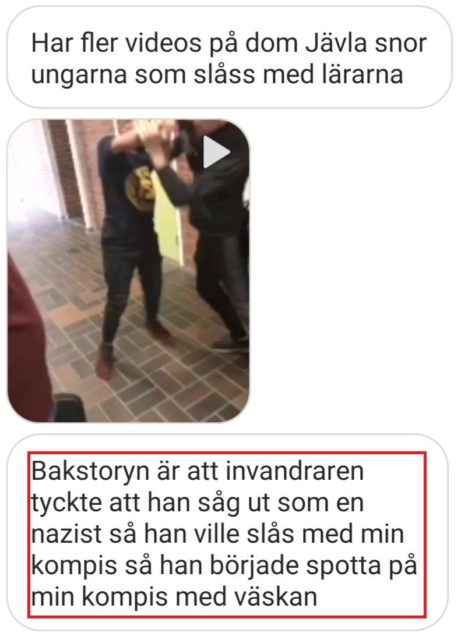 Nedan följer ett meddelande från en elev som delar en video från ett slagsmål som inträffade i förra veckan. Enligt uppgift ska eleven med väskan ha kallats ”nazist” och därefter mottagit en spottloska innan bråket utbröt.