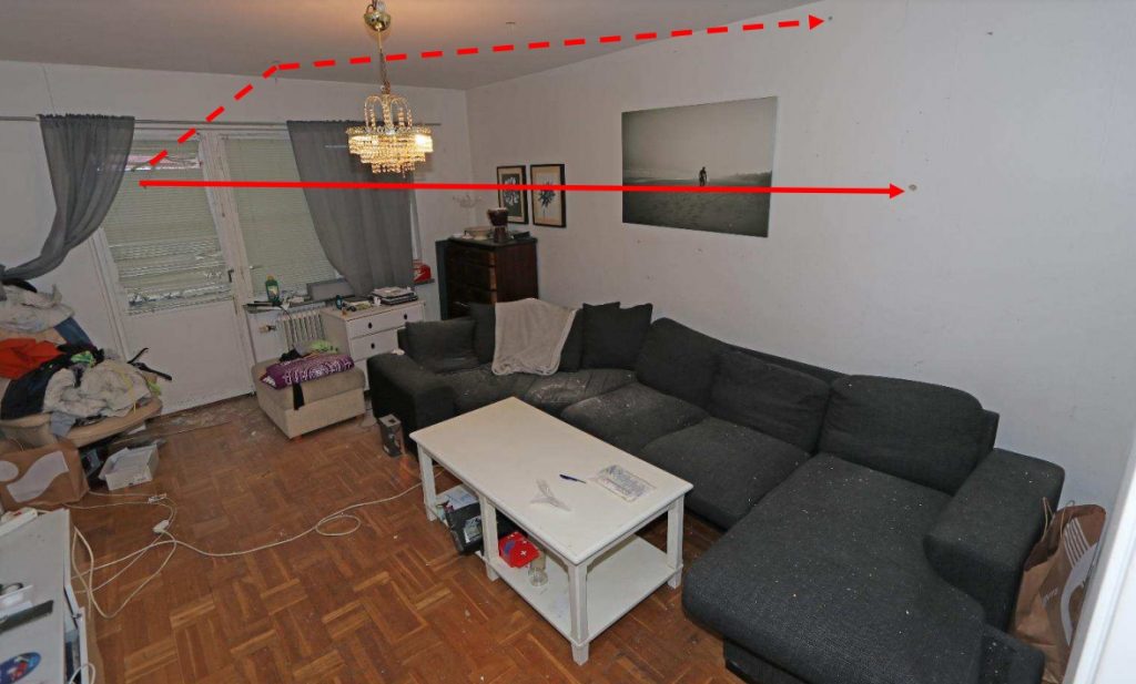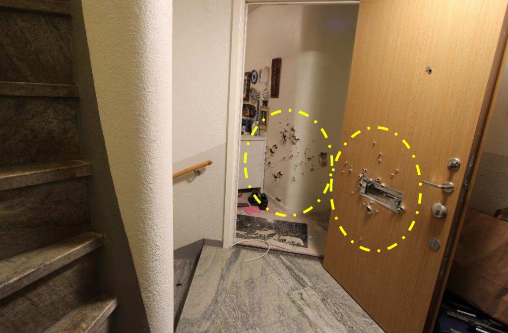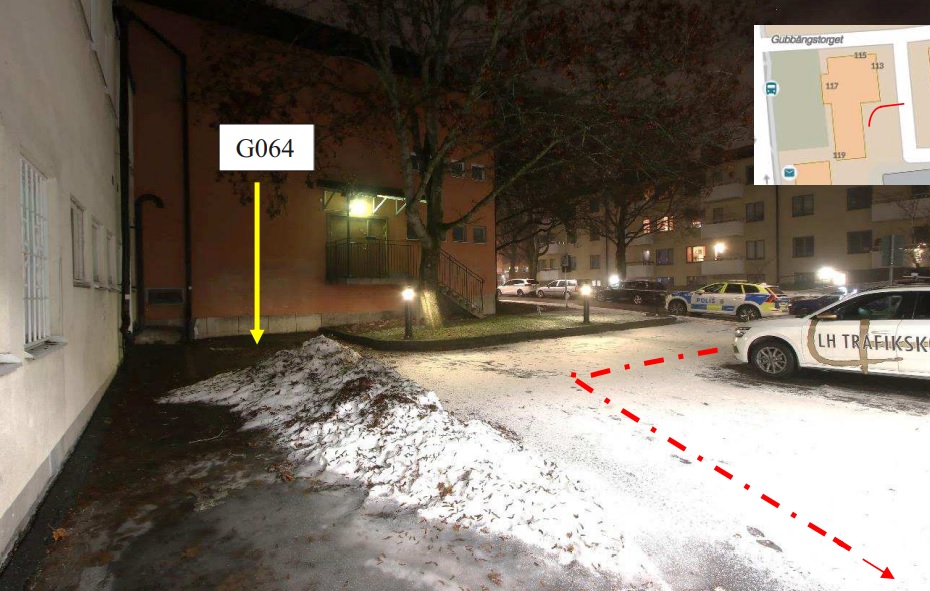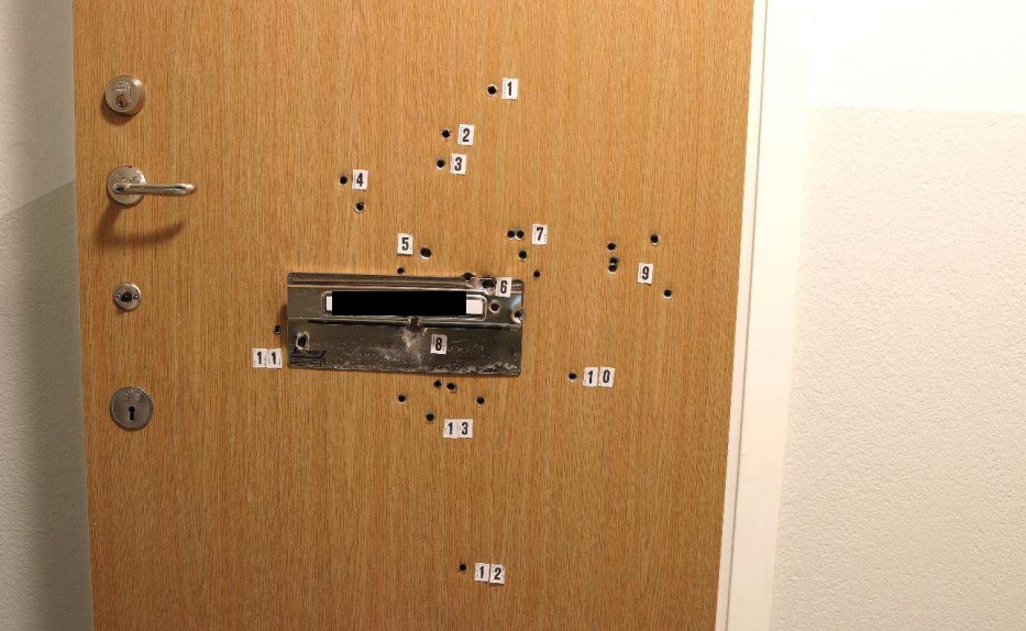 På det aktuella våningsplanets trappavsats och trappstegen nedanför låg 30 avskjutna patronhylsor av kaliber 7,62 x 39 mm. 24 skott hade gått igenom dörren och in i lägenheten. Skotten hade nått flera olika rum i lägenheten. Men i huset bodde en 67-årig man utan kopplingar till kriminalitet och polisens hyptes är att gänget slog till mot fel adress.