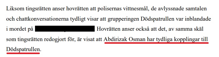 Det framgick av polisutredningen rörande mordet att Abdirizak Abdimalek Osman har nära koppling till det kriminella nätverket Dödspatrullen och att mordet var en del av den blodiga konflikten mot det andra Rinkebygänget Shottaz.