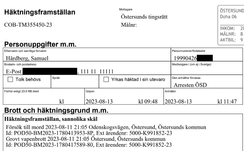 Samuel Hårdberg, 24, ändrat sin folkbokföring flera gånger och har nu ingen adress. Hårdberg är tidigare dömd för brott mot knivlagen, försök till bedrägeri och flera narkotikabrott.