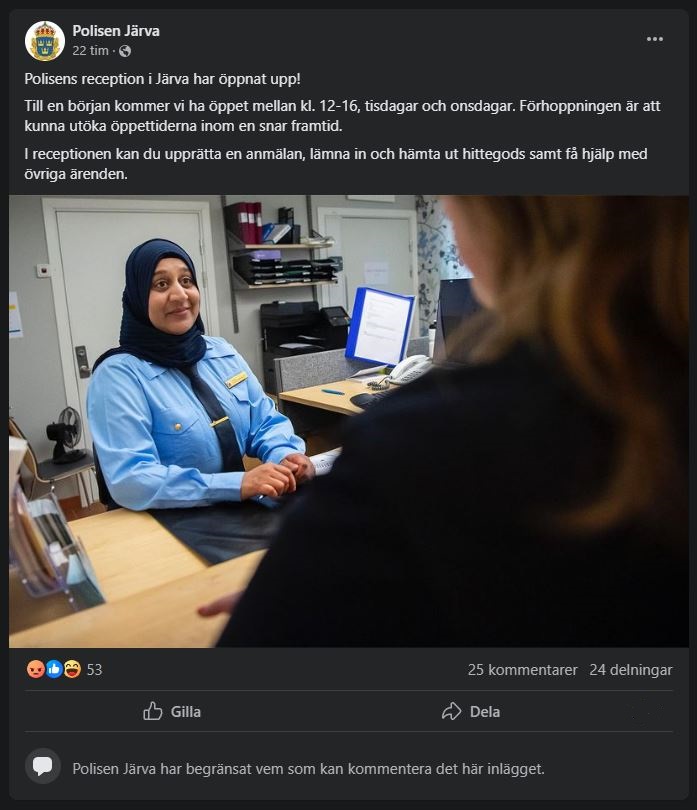 Järvapolisens inlägg gjordes på torsdagseftermiddagen och reaktionerna fick myndigheten att ”begränsa” vilka som kan kommentera – dessutom har man dolt redan befintliga kommentarer. Andelen ”arga” reaktioner är dock klart flest jämfört med tummar upp och skrattande smileys.