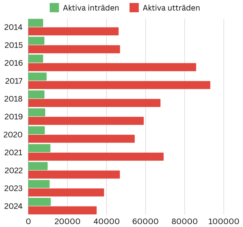Dels är det fler vuxna medlemmar som begär utträde än det är som anmäler att de vill gå med. Allra flest var det 2017, då anmälde drygt 93 000 utträde.