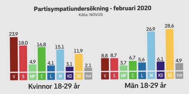 I samband med Novus senaste opinionsmätning presenterades även hur dramatiskt olika unga män och kvinnor röstar, där männen framför allt väljer SD och M och kvinnorna V, S och C.