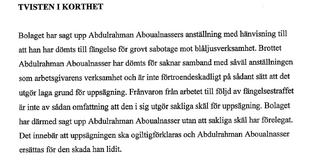 Osaklig uppsägning, anser fackförbundet Unionen som Abdulrahman Aboualnasser är medlem i. Tvisteförhandling på såväl lokal som central nivå inleds, men Stena Recycling vägrar behålla den fängelsedömde islamisten. Nu har därför Unionen vänt sig till Arbetsdomstolen för att få frågan prövad där.