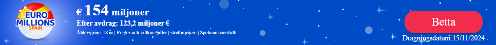 Du har chans att spela om en jackpott på 154 miljoner € (efter avdrag 123,2 miljoner fredagen den 15 november 2024. EuroMillions, Europas största lotto, har nämligen dragning då. För att spela om den fantastiska jackpotten och de övriga vinsterna är det bara att gå in på lottobettingtjänsten theLotter.se och betta på EuroMillions. Att spela på EuroMillions i Sverige