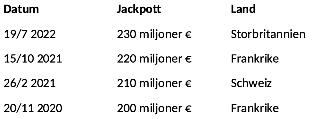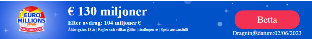 Att få chansen att betta om en europeisk jackpott på 130 miljoner € (efter avdrag 104 miljoner €) motsvararande cirka 1,5 miljarder svenska kronor (1,2 miljarder efter avdrag) händer inte många gånger om året. Och detta bästa av allt är att det är tryggt och säkert att betta hos lottobettingtjänsten theLotter Sverige.