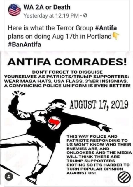 ”Klä dig som Trump-supporter” I sociala medier cirkulerade ett informationsblad inför lördagens demonstration som uppges vara publicerat av Antifa. I texten uppmanar man ”kamrater” att klä sig som Trump-supportrar för att smälta in i demonstrationen.