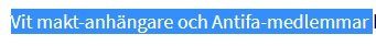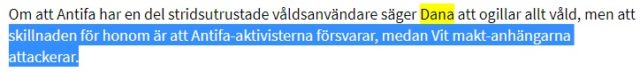 Sedan går man vidare att stämpla nationalisterna som ”vit makt” medan den vänsterextrema sidan bara beskrivs som ”Antifa-medlemmar”.