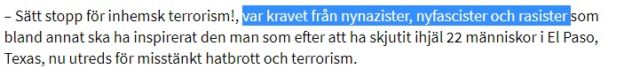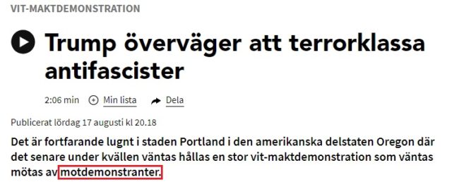 Statsradion uppmärksammar en nationalistisk demonstration i USA för att berätta att president Donald Trump överväger att terrorstämpla ”motdemonstranter” i Antifa. Public service-aktören missar att berätta att rörelsen är våldsbejakande vänsterextrem. När demonstrationen tog fart på lördagen rapporterades flera våldsamma attacker från Antifa – något som statsradion valde att inte återrapportera.