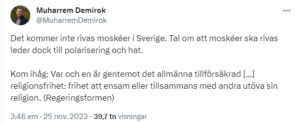 På lördagen höll Sverigedemokraternas ledare Jimmie Åkesson sitt linjetal på partikongressen Landsdagarna 2023. Åkesson delade med sig av sina förslag för att bekämpa islamismen i Sverige. Moskéer som sprider ”antidemokratisk, antisvensk, homofob eller antisemitisk propaganda eller allmän desinformation om det svenska samhället” – ska rivas. Vidare vill SD-ledaren se ett ”omedelbart stopp av etablerandet av nya moskéer”. Kort efter talet tog statsminister Ulf Kristersson (M) avstånd från Åkessons förslag.– I Sverige river vi inte gudstjänstlokaler, slog Kristersson fast.