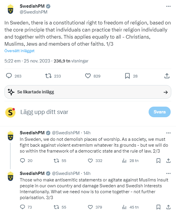 Vidare framför Kristersson att samhället ska slå tillbaka mot våldsbejakande extremism oavsett grund – men att det ska ske inom den demokratiska rättsstatens ramar. Statsministern är även besvärad över att att det uttrycks kritik mot islamiseringen eftersom att det ”skadar Sverige”.