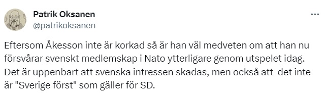 Även Nato-lobbyisten tillika centerprofilen Patrik Oksanen är besvärad över kritik mot islamiseringen. Han anklagar SD för att inte sätta ”Sverige först”.