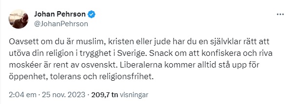 Liberalernas ledare tilika Tidökollegan Johan Pehrson har också tagit sig in i debatten. ”Snack om att konfiskera och riva moskéer är rent av osvenskt”, skriver L-ledaren på X, tidigare Twitter.