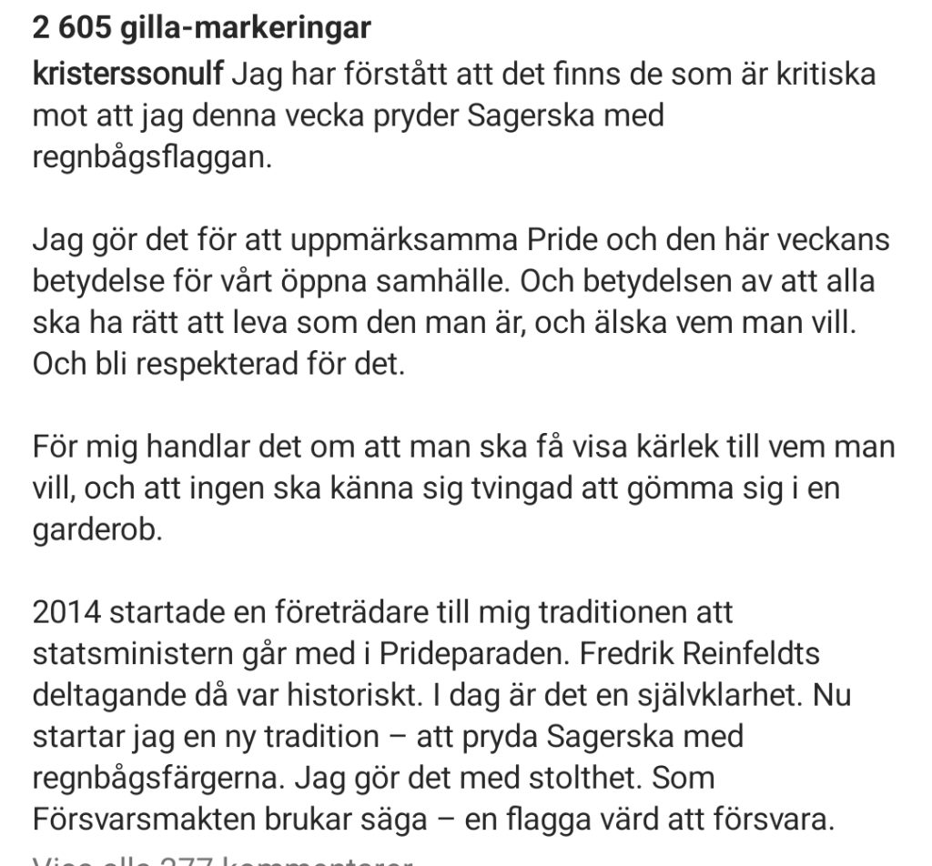 ”Jag har förstått att det finns de som är kritiska mot att jag denna vecka pryder Sagerska med regnbågsflaggan. Jag gör det för att uppmärksamma Pride och den här veckans betydelse för vårt öppna samhälle. Och betydelsen av att alla ska ha rätt att leva som den man är, och älska vem man vill. Och bli respekterad för det”, skriver statsministern.
