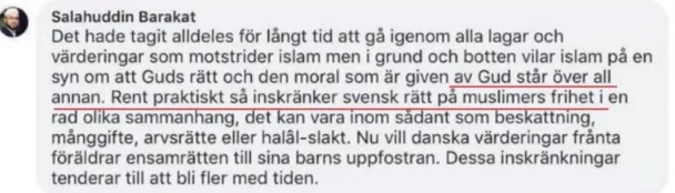 På Facebook har han skrivit att islam står över allt annat, inklusive svensk lag.