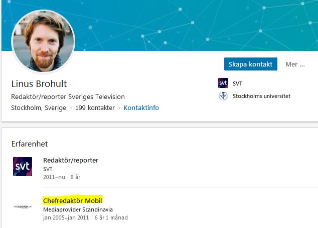 När Samhällsnytt tittar närmare på statsjournalisten Linus Brohult bakom reportaget visar det sig att han har starka band till mobilindustrin som han skulle granska i sina reportage. Under sex år mellan 2005 och 2011 arbetade han som chefredaktör för landets största branschtidning Mobil: