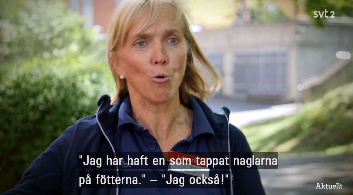 I reportaget framkommer att det finns en stor grupp av coronapatienter som inte tycks bli friska på flera månader, utan får ständigt nya allvarliga symptom. Ett av de nya symptomen som listas av statstelevisionen är när coronasjuka börjar tappar tånaglarna. Detta anser den intervjuade allmänläkaren på Torsviks vårdcentral på Lidingö Louise Eggimann är ”jättespännande”. Hon berättar entusiastiskt för statstelevisionen: