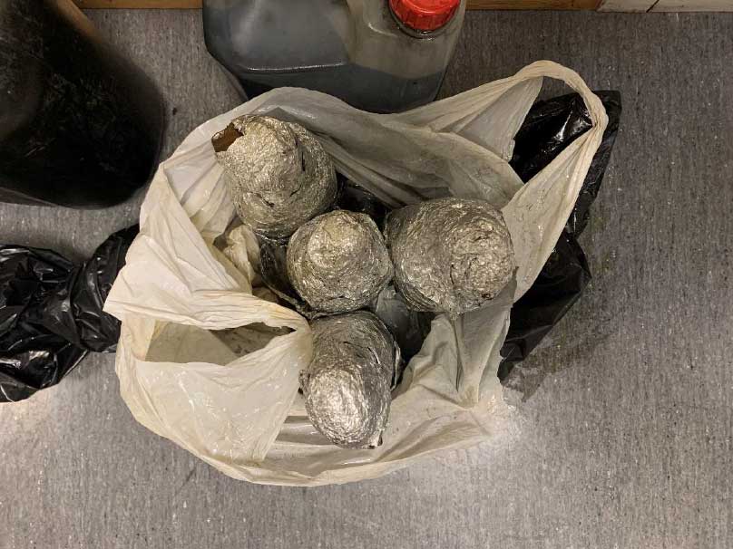 Beslagtagna brandbomber, s.k. molotovcocktails, och dunkar med eldfängd vätska. Bild: Polisen.