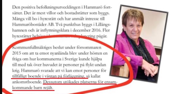 Bilden nedan är tagen år 2014 och visar hur centerpartisten Margareta Ivarsson, som än idag är ordförande i socialnämnden, under pompa och ståt inviger två nya fastigheter för ’ensamkommande’ migranter.