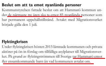 Kommunen har även under det gångna året lyft fram den höga invandringen till kommunen som positiva händelser. Bland annat berömde man sig för att ha tagit emot ”fler ensamkommande barn än vad kommunen avtalat om”. Utöver tvångsanvisningarna från staten har politikerna lokalt fattat frivilliga beslut om ett än större mottagande av migranter.