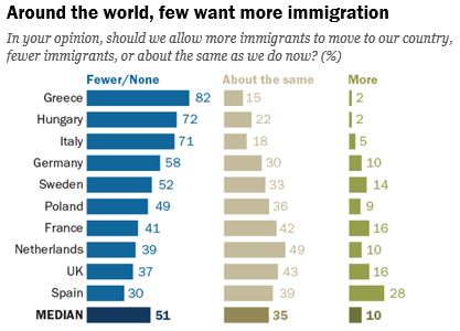 I Europa finns störst motstånd i Grekland där 82 procent vill ha färre eller inga fler migranter. På andra plats kommer Ungern med 72 procent följt av Italien med 71. Sverige kommer på en femteplats med 52 procent efter Tyskland med 58.