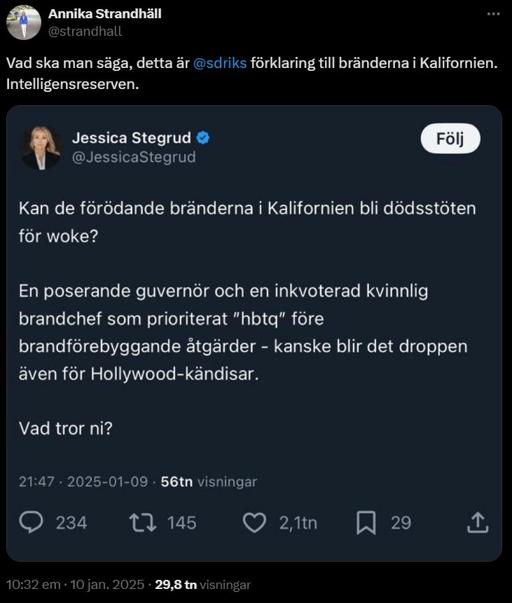 Trots tidigare löften om att använda plattformen mindre fortsätter S-toppen Annika Strandhäll med sina mer eller mindre udda utspel på X, tidigare Twitter. Denna gång beklagar hon sig över en sverigedemokrats åsikter kring hur politisk korrekthet spelat en roll i det som nu sker i Kalifornien.
