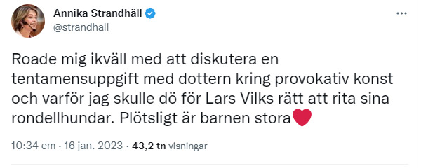”Roade mig ikväll med att diskutera en tentamensuppgift med dottern kring provokativ konst och varför jag skulle dö för Lars Vilks rätt att rita sina rondellhundar. Plötsligt är barnen stora”, skriver Strandhäll.