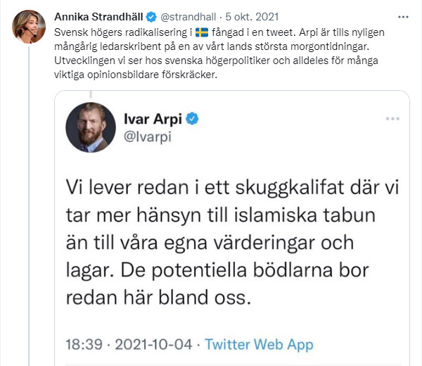 Strandhäll undvek att överhuvudtaget beklaga eller kommentera Lars Vilks död, utan valde istället att gå till angrepp mot Arpi för hans text om den nyligen avlidne konstnären. Hon skrev på Twitter om ”svensk högers radikalisering” och att den ”förskräcker”.