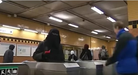 Muslimsk kvinna i Stockholms tunnelbana. Faksimil YouTube.