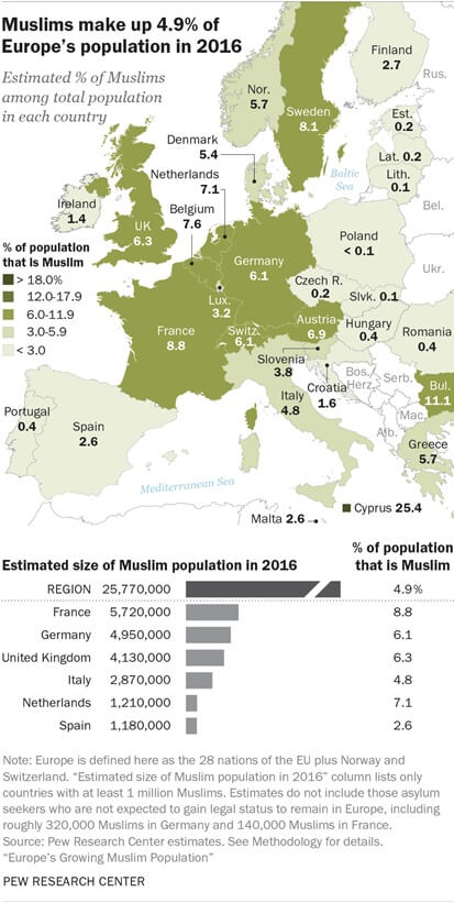 Baserat på 2016 års siffror kommer andelen muslimer till 2050 – givet att invandringen stoppas helt här och nu – att ligga på 7,4 procent av Europas befolkning. Det motsvarar 30 miljoner och är en kraftig ökning på dagens andel på 4,9 procent (25,8 miljoner).