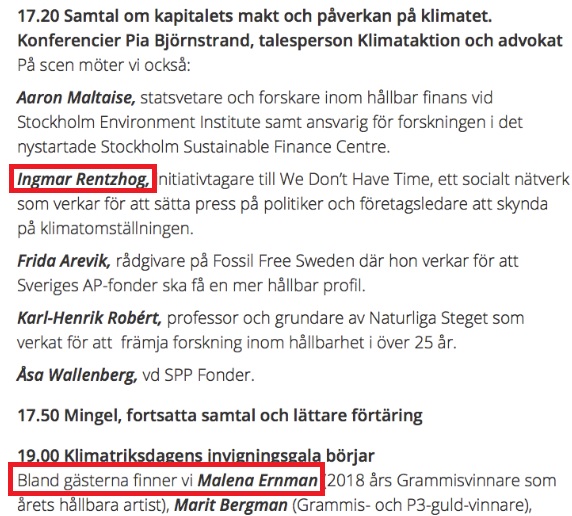 Det illustrerade att talesättet ”världen är liten” stämmer när Rentzhog av en slump sprang på dottern till Malena Ernman. Just den Malena Ernman som deltog vid samma klimatkonferens i Klimatriksdagen den 4 maj 2018.
