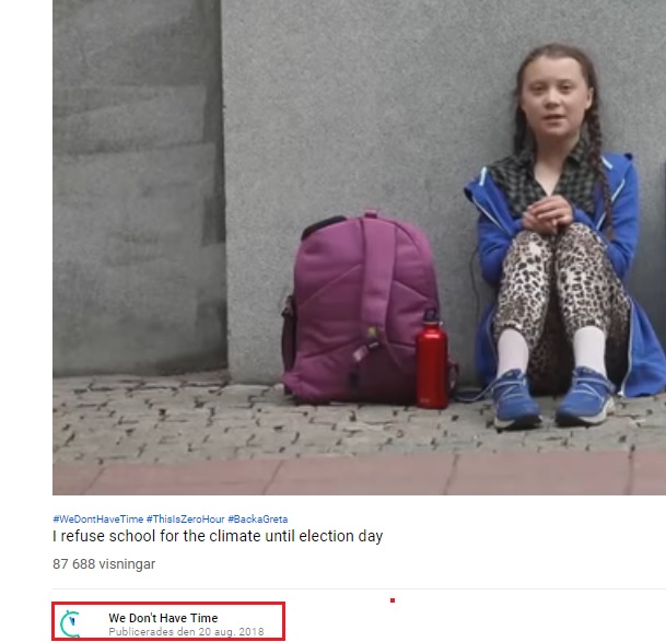 Det är ingen nyhet att företaget We Don’t Have Time med grundaren Rentzhog har engagerat sig hårt för att använda den unga flickan som SvD kallar ”dragplåster”. Nedanstående videoklipp har bolaget klart redan samma dag (2018-08-20) som Klimat-Greta valde att spontant strunta i skolan och inleda sin strejk. Rentzhog har redan hunnit ordna ett engelskt manus, filma, redigera och publicera resultatet som skulle presentera Klimat-Greta för omvärlden.