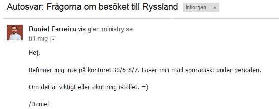När vi ställer våra frågor via sms får vi ett nytt påbud – att mejla dem istället. När vi har mejlat frågorna får vi följande autosvar:
