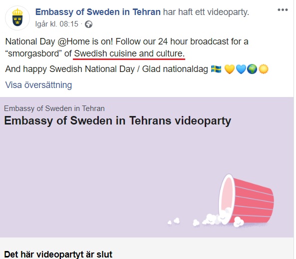 Mattias Lentz är ambassadör i Teheran och marknadsförde tillställningen inför iranier på engelska. Med anledning av den pågående pandemin meddelade Lentz att iranierna ska få ta del av vad svensk kultur är genom ett digitalt firande på Facebook.