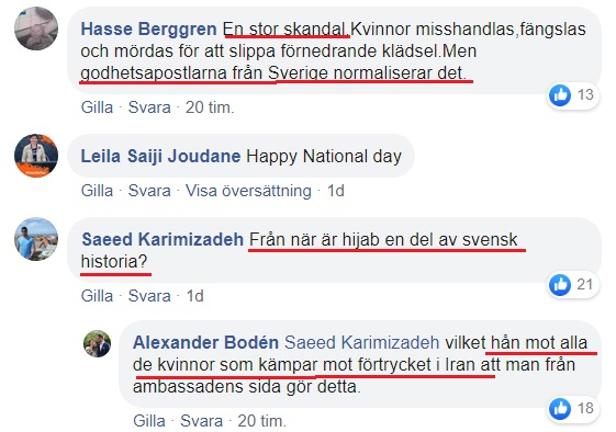 Irans samtliga TV kanaler och media visar i 24 timmar om dygnet hijabi kvinnor (av bästa kvalité) och mullor, folket vänder sig mot Väst och utländsk media och söker annorlunda livsstil. Och Sveriges ambassad, en av världens mest sekulära länder, gör reklam för islamism, bra jobbat! Fuck you Swedish leftis, you politically corrects and especially you Mr. Ambassador!