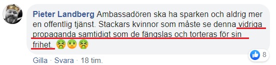 I kommentarsfältet möter den svenska ambassaden i allmänhet och ambassadör Lentz i synnerhet hård kritik. En person anser att ”godhetsapostlarna från Sverige normaliserar” att kvinnor misshandlas, fängslas och mördas när de trotsar Irans islamiska lag med påtvingad slöja.