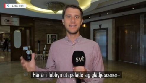 Statstelevisionen gläds I hotellet som Galvez bor på i irakiska staden Erbil finns även statstelevisionen på plats. SVT:s reporter Thomas Thorén kan inte neutralt hålla leendet borta när han beskriver för tittarna att det varit ”glädjescener” i lobbyn.