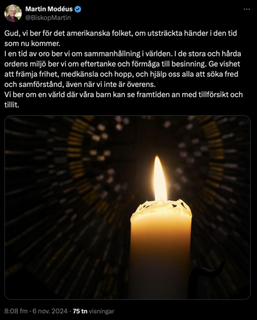 På onsdagen kommenterade ärkebiskop Martin Modéus det amerikanska presidentvalets utgång. Detta genom ett inlägg att Svenska kyrkan ”ber för det amerikanska folket” och antydde att USA går mot en mörk tid.