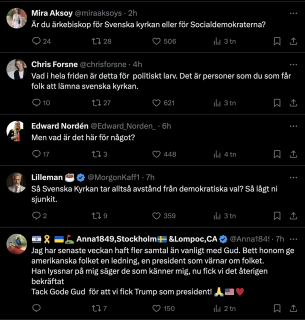 Inlägget har väckt många reaktioner i kommentarsfältet. Samnytts tidigare medarbetare Mira Aksoy har frågat om Modéus är ärkebiskop för Svenska kyrkan eller för Socialdemokraterna.