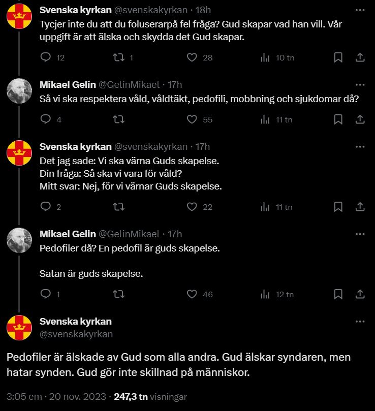 I ett meningsutbyte hävdar Svenska kyrkan att deras uppgift är att ”älska och skydda det Gud skapar” varpå en användare frågar ifall det även gäller ”våld, våldtäkt, pedofili, mobbning och sjukdomar”.