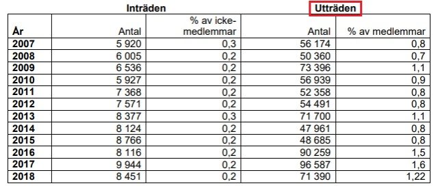 En närmare titt på utträden under perioden år 2008-2018 visar att hela 714 126 personer av det sammanlagda medlemstappet på 852 710 är registrerade som ”utträden”. Det är oklart huruvida detta inkluderar både avlidna och de som aktivt har valt att lämna kyrkan.