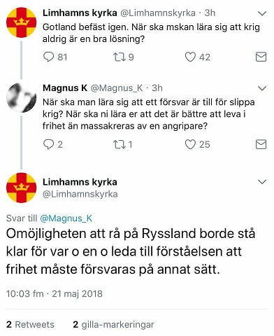 Vår tweet om ett befäst Gotland har väckt starka o många reaktioner. Vi tar nu bort den. Fortfarande tror vi dock på fred o icke-våld. Det tillhör trons kärna. @svenskakyrkan — Limhamns kyrka (@Limhamnskyrka) 21 maj 2018