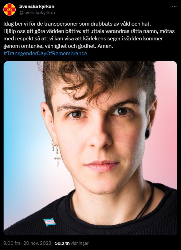 I takt med att Svenska kyrkan tagits över alltmer av krafter på den yttersta vänsterkanten tycks man göra allt för att skrämma bort de som ännu inte valt att gå ur. Det är utspel om hbtq, påstådd rasism och miljöalarmism – och nu gör man alltså ytterligare ett då man importerar ännu ett politiskt korrekt fenomen från USA till Sverige, som har föga med svenska förhållanden att göra, med ”Transgender Day of Remembrance”.
